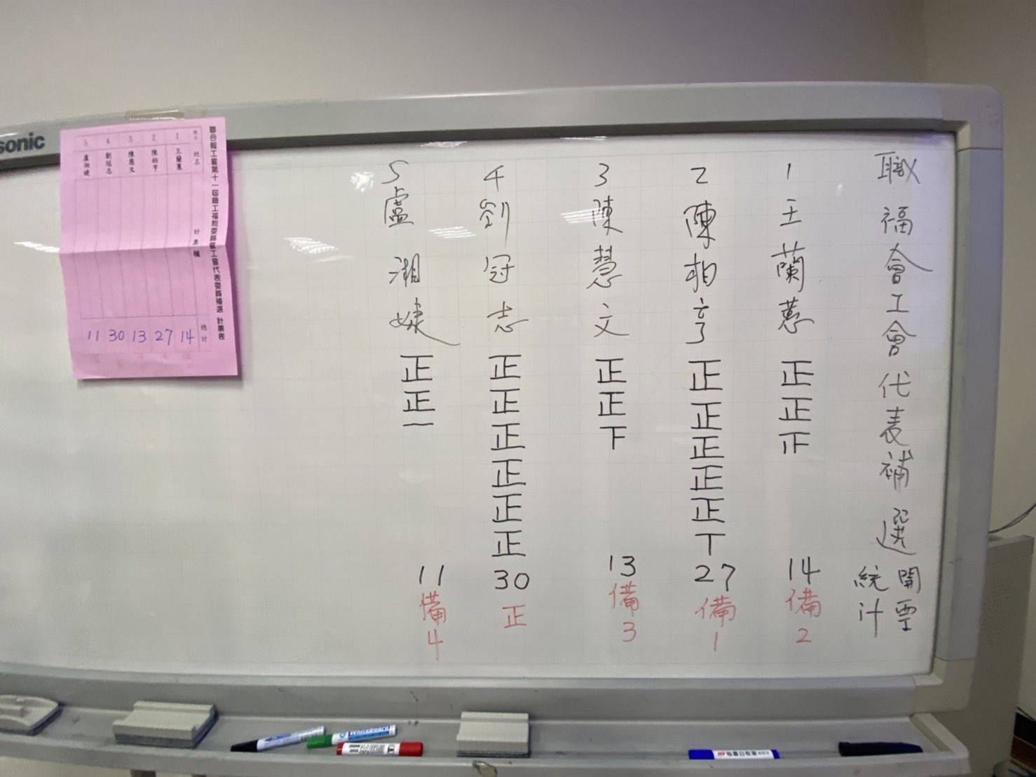 【本刊訊】工會會員代表大會11月3日召開,並補選職福會的勞方委員,有五人參選,選出一名正取委員與四名備取。出席會員代表共投出卅九張有效票,由行動發展部工程師劉冠志拿下最高票30票,順利當選職福委員。其他四名備取委員依得票高低,分別為陳柏亨、王蘭蕙、陳慧文與盧湘婕。