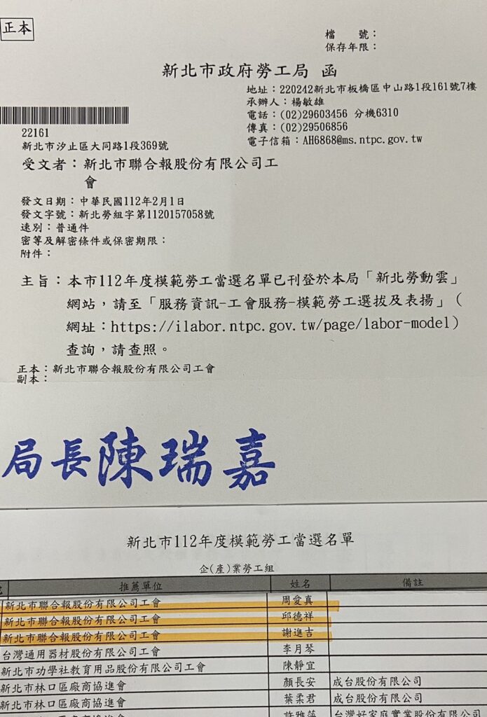 【本刊訊】聯合報工會推薦會員參與新北市政府112年模範勞工選拔,今天確定總務組周愛真、新聞部邱德祥、印務部謝進吉在眾多角逐者中脫穎而出當選,恭喜三位在工作崗位上兢兢業業的模範勞工。
