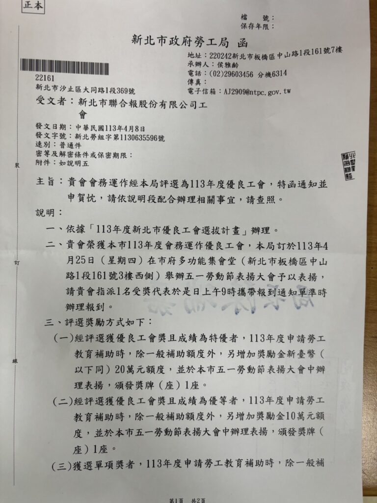 【本刊訊】113年五一勞動節優良工會評選,本工會在三百多個工會中脫穎而出,拿下「特優工會」中第一名。理事長楊金嚴感謝大家對工會的支持,因為有「特優工會」加持,工會服務大家、辦理勞教會更有底氣。