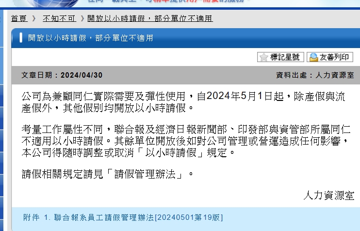 社方4月30日於聯八達公告,但報系並非所有部門都適用「小時請假」,有四大單位被排除,包括聯合報新聞部、經濟日報新聞部、印發部與資管部。但會員若請產假與流產假,也不能使用「小時請假」。據悉被排除部門,主要是全面落實有難度,考量到人力運作、工作屬性不適合開放,目前不列入。