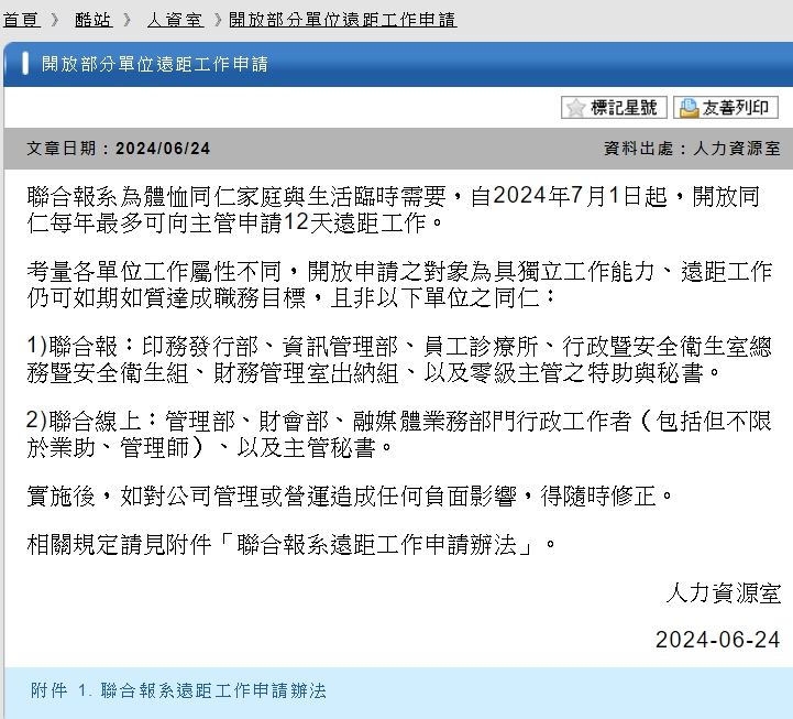 特別的是,這項「遠距工作申請辦法」不只聯合報系同仁、聯合線上公司也能享用。不過遠距工作仍有排除條款,以下部門不適用: