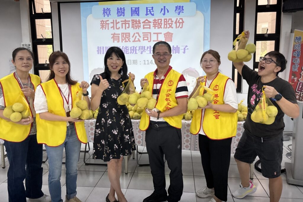 工會理事長楊金嚴今天率常務理事王松美、理事劉秀娟、黃子杰、劉冠志、委員王為泰、總幹事吳佩玲與會務陳思帆,分別前往樟樹國小與忠孝里贈送柚子,樟樹國小校長邱俊傑還致贈感謝狀給聯合報工會,謝謝我們行善不忘學童。