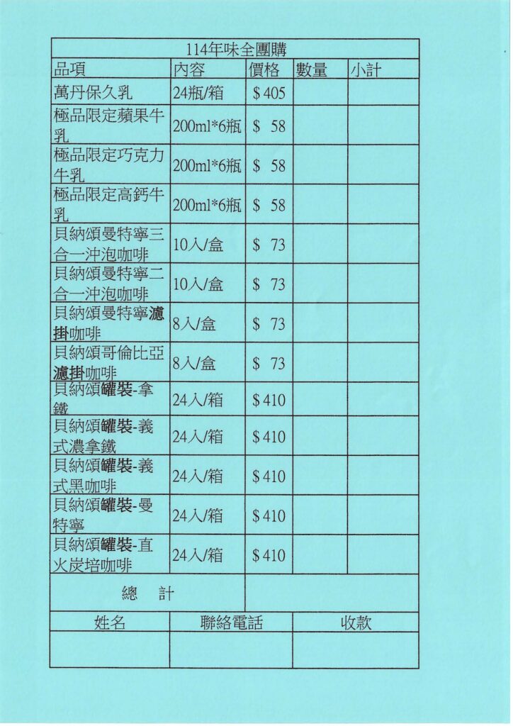工會即日起至12/15開放團購味全商品,價目表品項價格和去年一樣,沒有漲價,歡迎大家到工會來下單訂購。